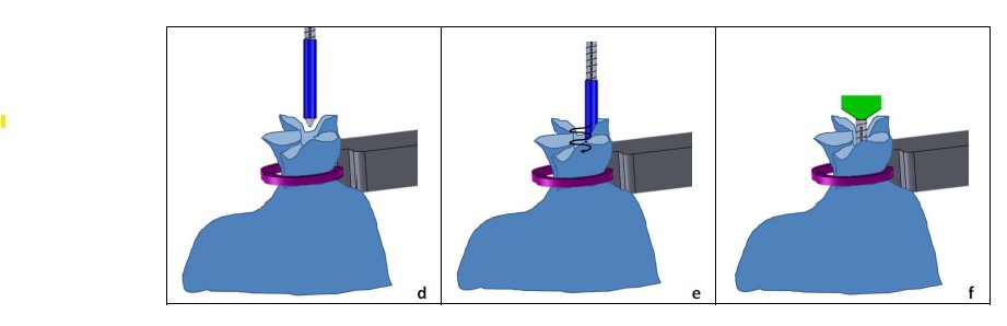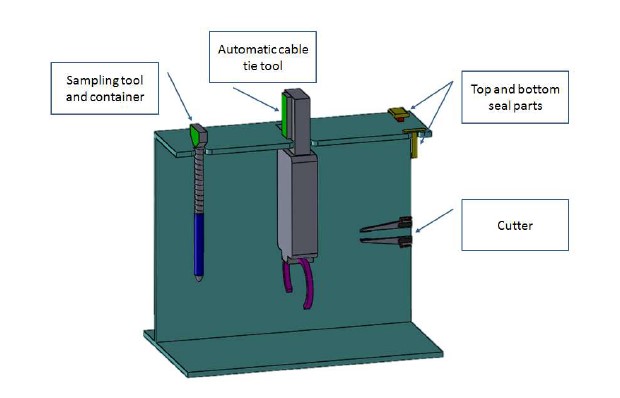 - Arm2 grabs an automatic cable tie tool from the tool stand, whose details are mentioned in the relative appendix. The automatic tool encloses the inner bag just above the cable strap that is currently in position.