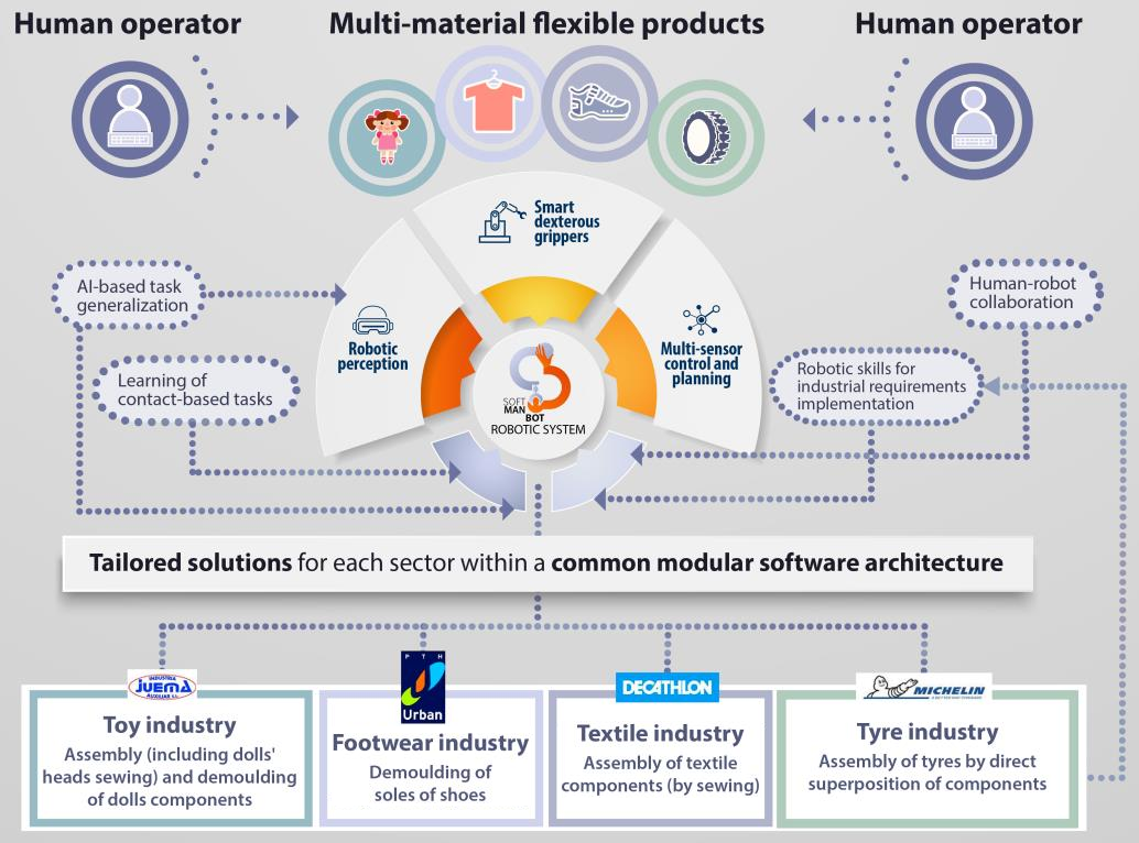 (Advanced Robotic Technology for Handling Soft Materials in Manufacturing Sectors - H2020-NMBP-FOF-2019 RIA GA869855 2019-23) is an industrial-end-user driven project that will provide an innovative and holistic robotic system for the handling of flexible and deformable materials within labor-intensive production processes. The robotic system will be composed by three main pillars including a generic robotic perception system (perception of the product and the human operator), a multi-sensor control and planning platform (advanced control algorithms for shape and contact servoing, AI based task generalization) and smart dexterous grippers (smart mechanical design which will embody grasping/manipulation skills and integrate sensors – mainly tactile – for identifying precisely the contact state between the product and the gripper) able to handle soft components with high-levels of robustness and flexibility.